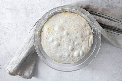 STEP 3. Grease a large bowl (that can accommodate the dough when doubled in size) with a generous amount of olive oil - 1/3 of what its called for. Pour the dough into the bowl and move around to coat it in oil. add the rest of the oil on top of the dough and move it around inside the bowl a bit more to make sure the oil is distributed throughout. Its okay if there are pools of oil around the bowl. In fact, thats actually what we're looking for. Cover in plastic wrap or a damp kitchen towel (make sure it does not touch the dough) and let rest for 1 hour in your counter or until doubled in size.